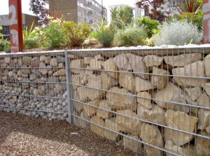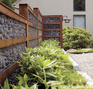 Цікавим та надійним методом будівництва огорожі є поєднання з двох матеріалів. Коли, з металевого прутика зварюють сітку, у яку і засипають камені різного чи одинакового розміру. Це по справжньому чудово виглядає та надійно захищає. Тут звичайно потрібний і міцний фундамент.