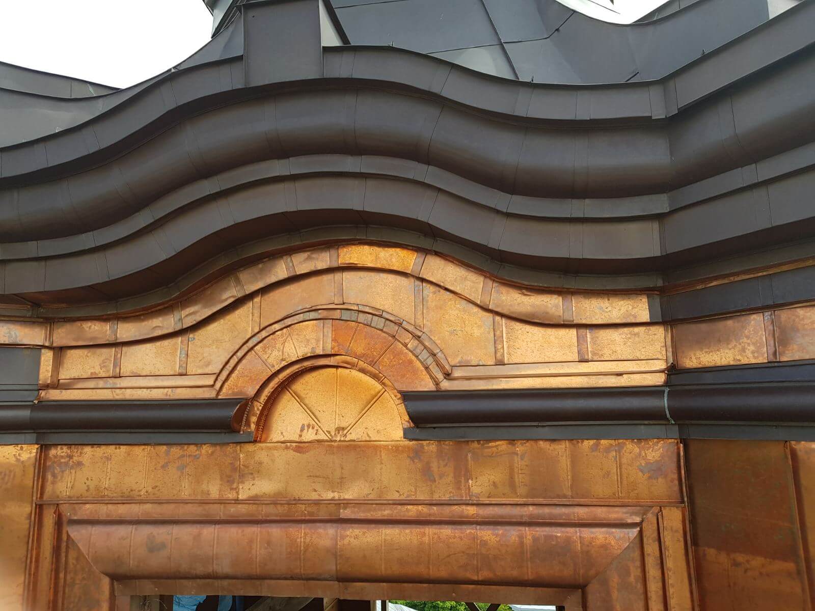 Гонтова або черепична покрівля виконується з окремих мідних елементів невеликого розміру, що укладаються нахлестом один на одного.
